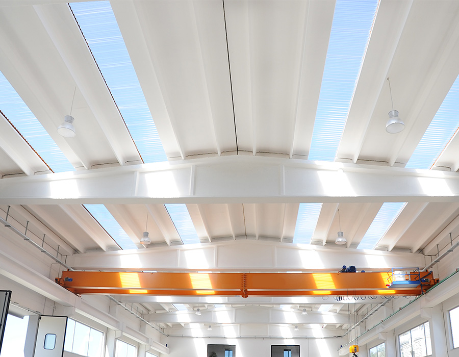 The prefabricated system “Double slope” is build to fulfill the needs of specific industrial buildings. DP beam have a section of 50/55 cm width, for a bigger support in top of the columns. Inserts on top of the columns are connected with DP beams, creating stability towards wind forces and moves of crane - bridge.