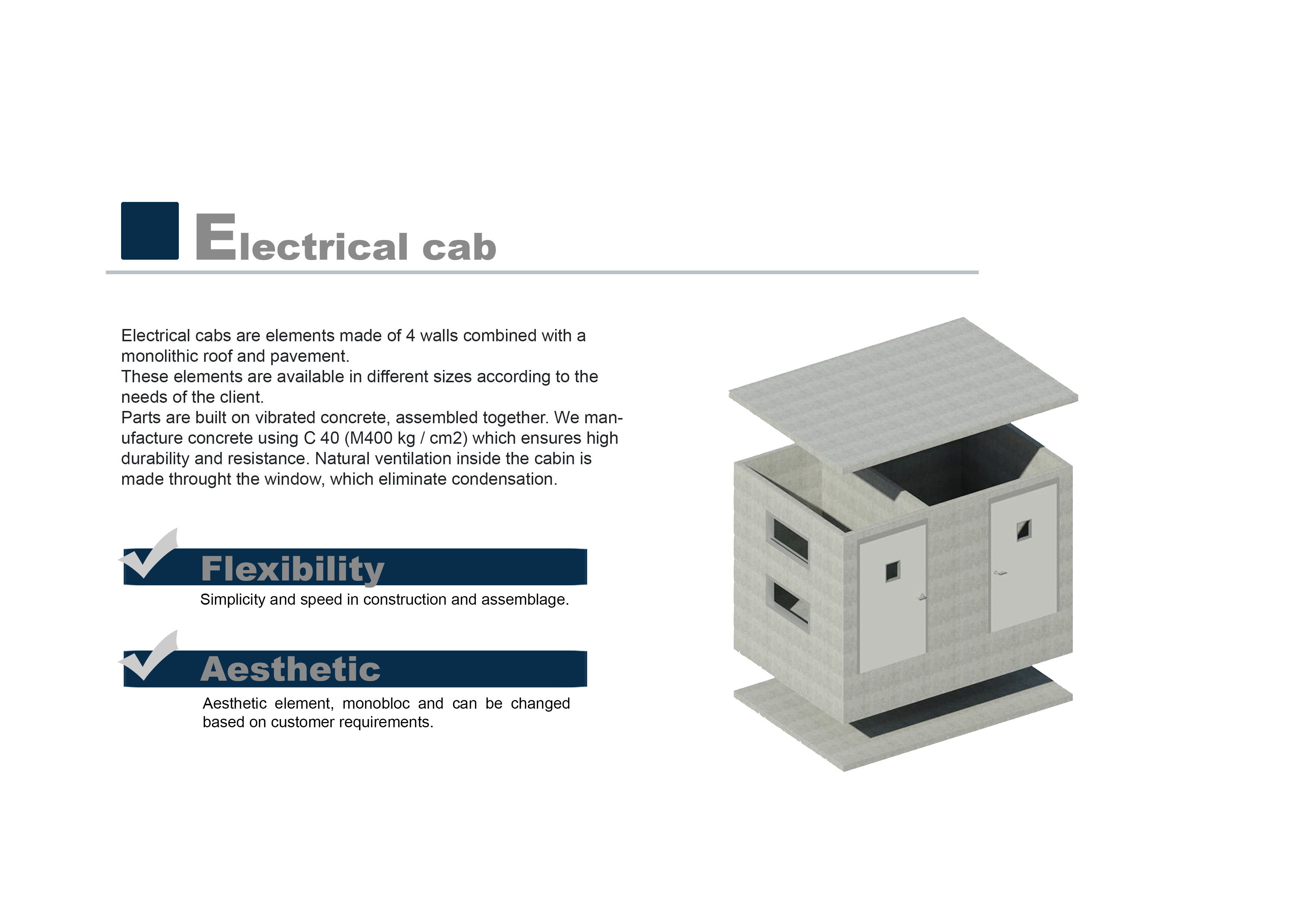 Electrical cabs are elements made of 4 walls combined with a monolithic roof and pavement.Te dhenat teknike: Standart dimmentions 418 x 298 365 x 250 * dimmentions vary based on customer requirements Shkarko Skeden: Tech data - Electrical cab.pdf