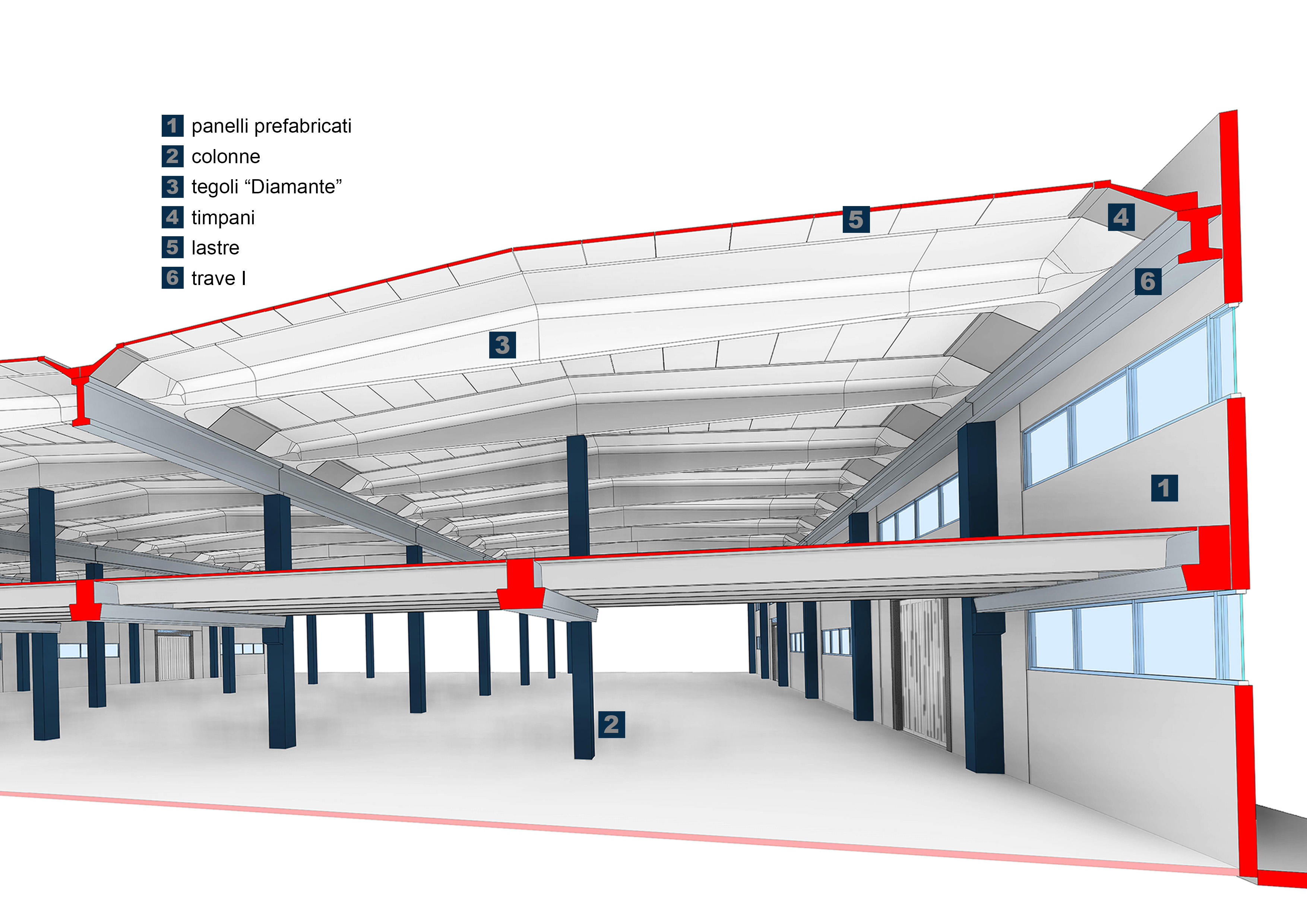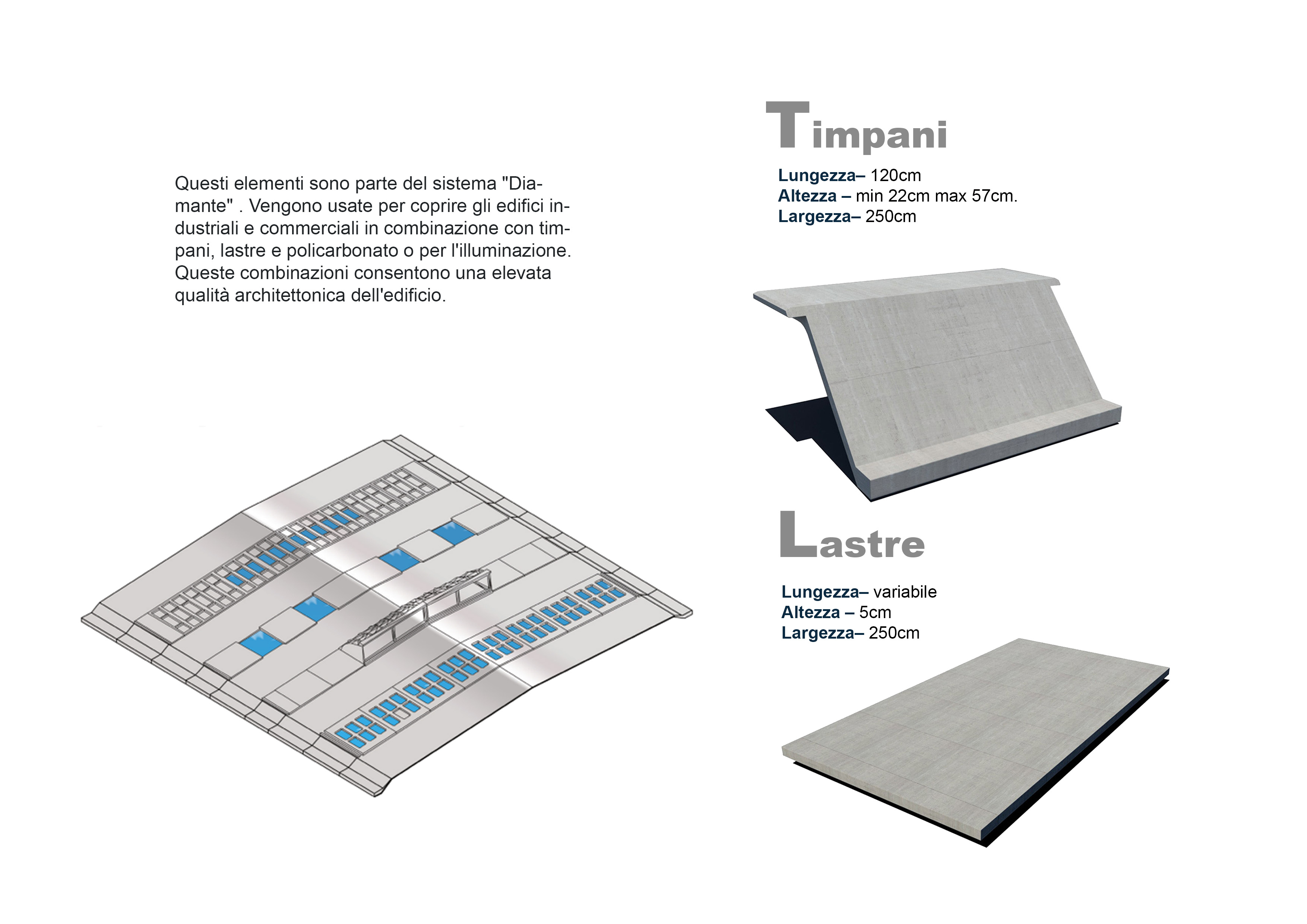 Il sistema di "Diamante" è la risposta alle richieste dei clienti piu esigenti che sono sempre alla ricerca di funzionalità e qualità nell'ambiente di lavoro, illuminazione naturale, isolamento acustico e di alta protezione antincendio; tutto questo combinato con elevata affidabilità e costo ottimale di manutenzione e gestione. L'elemento "Diamante" e combinato con lastrine, timpani o policarbonato.
