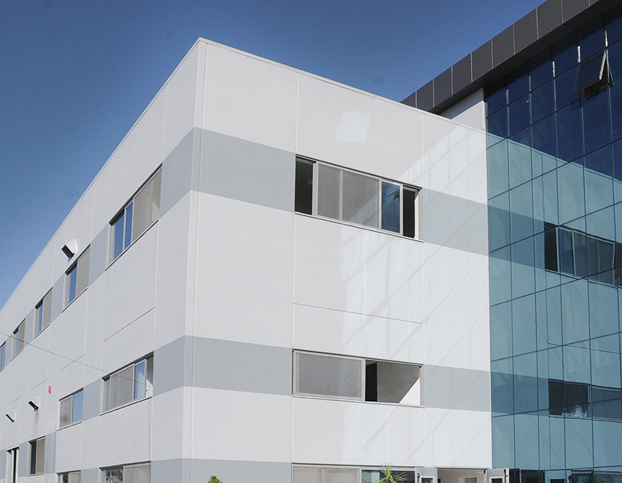 Edificio prefabbricato a 2 piani + 4 piani uffici, dove la copertura e l'interpiano ha una struttura con travi TLP, TR e tegoli TT.