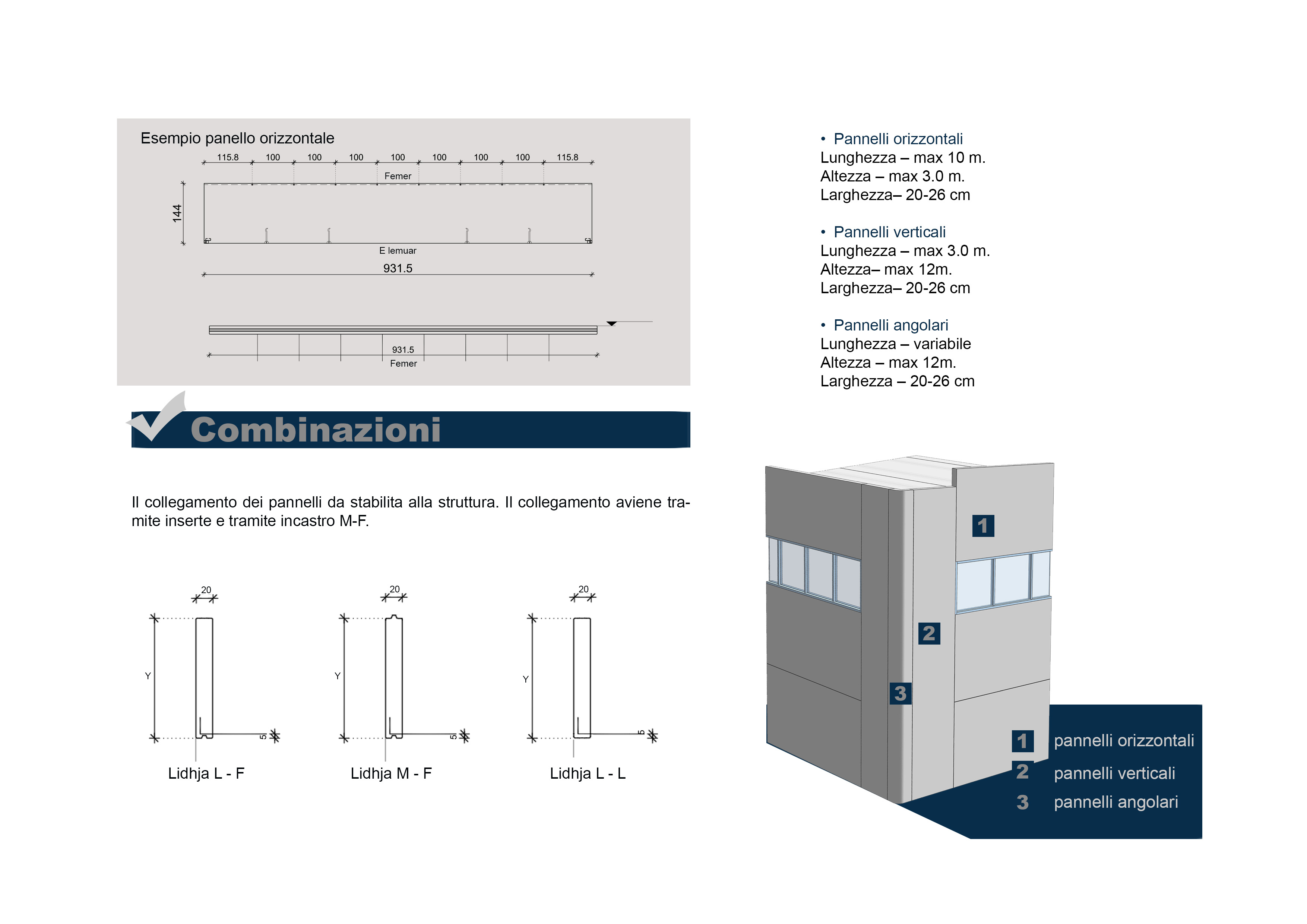 Il rivestimento degli edifici prefabricati si completa con pareti prefabricate composte da cemento armata e uno strato isolante di polistirolo. I panelli sono elementi prefabricati verticali, orizzontali , angolari o sezionate diversamente a seconda dell progetto architettonico. Sulla base della selezione estetica per ogni progetto, i pannelli sono disponibili in versione semplice (grezzo in cemento che può essere verniciato con qualsiasi vernice senza la necessità dello stucco) e la variante granigliata (parete prodotta con superfice rivestite con granulato di tono che varia in base alla richiesta del cliente).